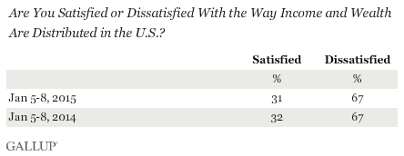 “…dissatisfaction is relatively high with the way income and wealth are distributed in the country today, indicating that the public’s concern is focused more on the inequality of results as the system plays out, rather than on the chances people have of improving their lot within the system. These attitudes are not new. Gallup polling over the decades has consistently shown that Americans believe money and wealth should be distributed more equally in U.S. society, and have consistently supported higher taxes on the rich to help achieve that aim.”