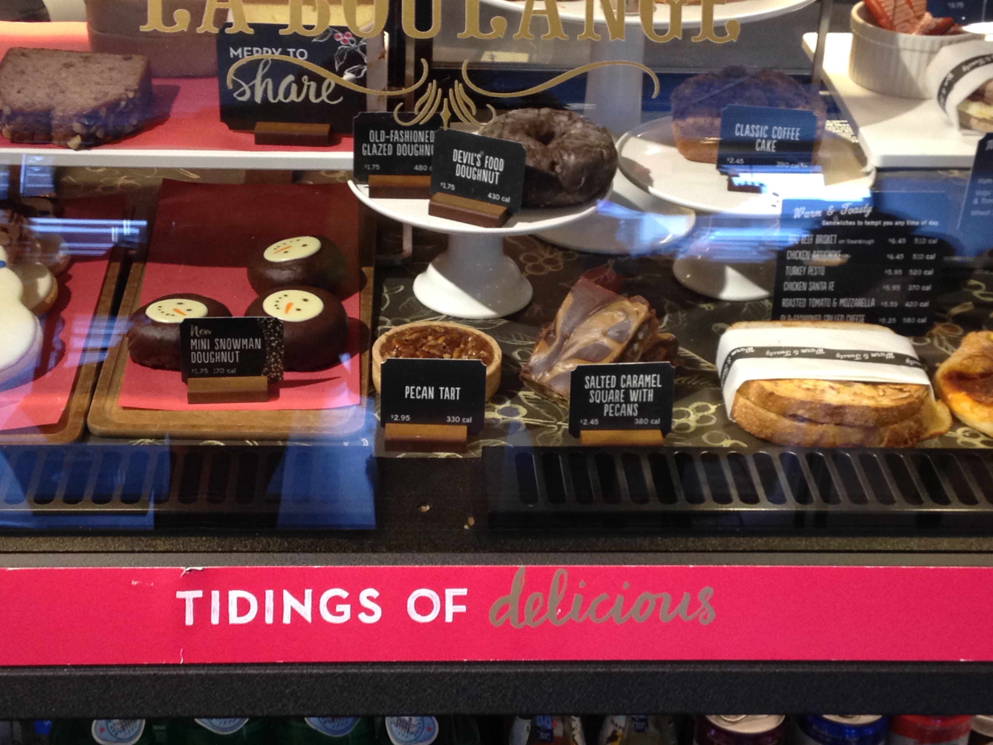 There is a bright red banner across the glass front of the pastry case at our Starbucks in Multnomah Village. It says, “Tidings of Delicious.”