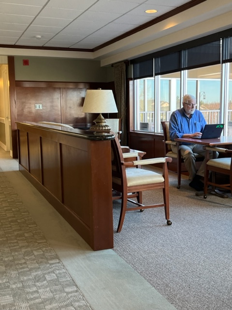 If English has a verb that meant working/playing, it is the word I would use to tell passersby what I am doing on my “front porch.” As you can see by the picture, the front porch is like a long lobby on the other side of the hall from our apartment. When we first moved in, I referred to it as “an extra living room;” then as a parlor (where one would parlez). But my daughter, Dawne, who lives in New Jersey and knows how front porches are used, said, “That’s not a living room. That’s a front porch.” And so it has been, in our family’s language, ever since.