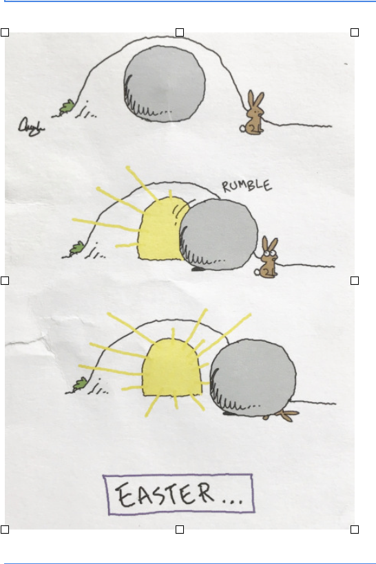 So here’s the card. The bunny is facing away from the tomb; also away from the rock covering the entrance to the tomb. He notices—too late—that the rock is headed his direction and just after he notices it, the rock crushes him and kills him.